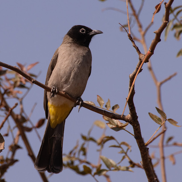 bulbul (also known as a yellow-vented bulbul) as it perched on a branch - its yellow